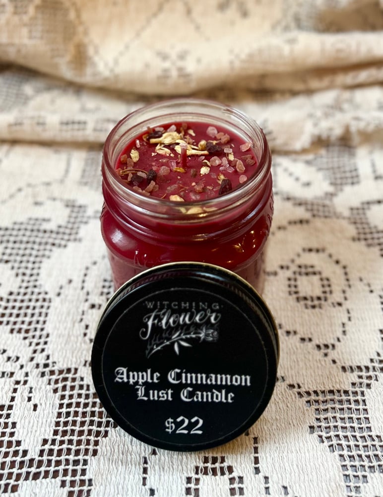 Handmade from soy wax, apple harvest oil, apple Macintosh oil, red wax dye, gold shimmer, pink Himalayan salt, and jasmine flowers. Shimmers as it burns and made from pthtlate free scented oils.