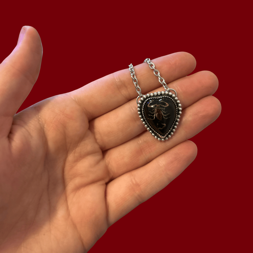 Genuine heart shaped scorpion resin cabochon inside a sterling silver, south western styled pendant. The chain is stainless steel.