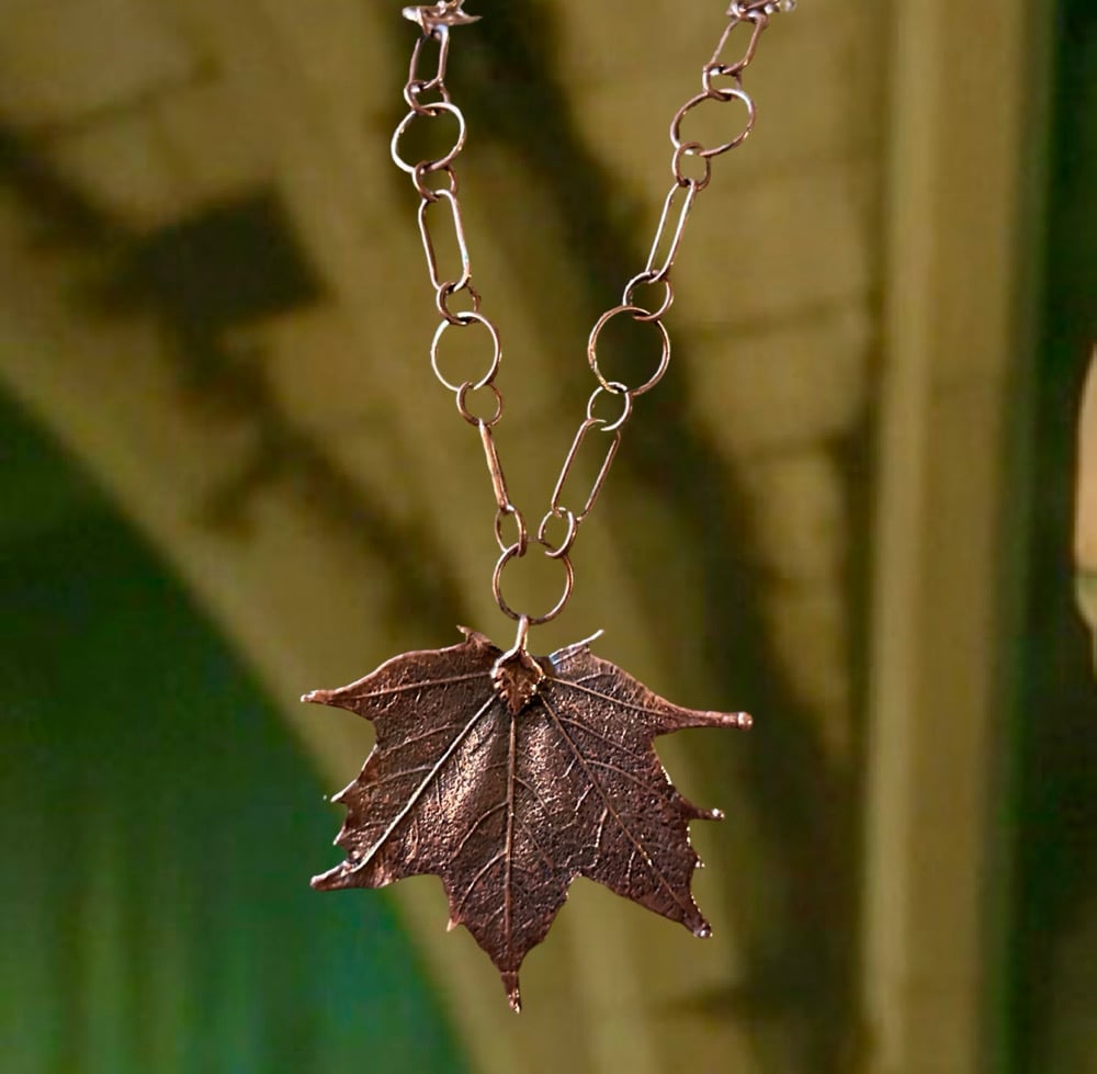 From the Frankenstein Collection. An electroformed copper maple leaf (made by Fabulous Rocks) on a copper chain I handcrafted 16 inches long.
