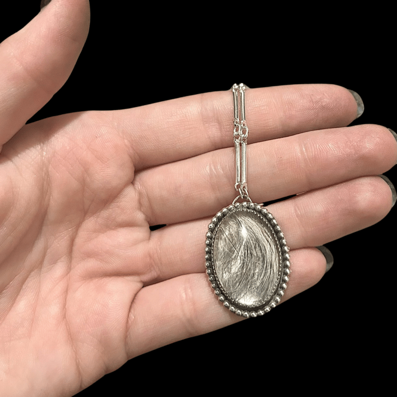 This is a custom listing for this style of memorial necklace. The pendant is entirely made from sterling silver. This style includes a serrated styled bezel wire, beaded bezel wire, glass oval shaped cabochon, and a sterling silver chain. There will be a drop down option for the length of the chain.