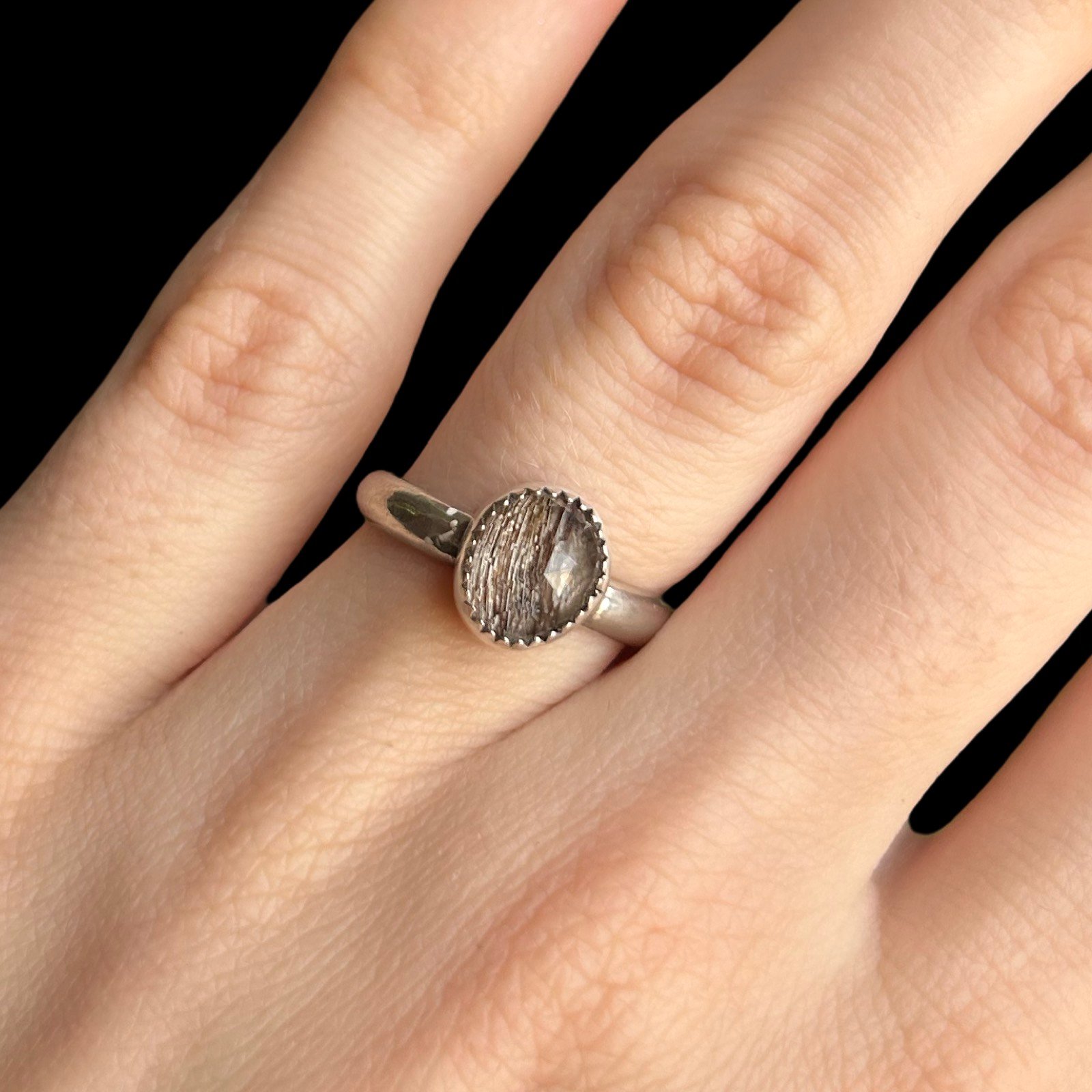This is a custom listing for this style of memorial ring. Entirely handmade from sterling silver. This style includes serrated bezel wire, plain band, and a clear quartz (rose cut) cabochon.