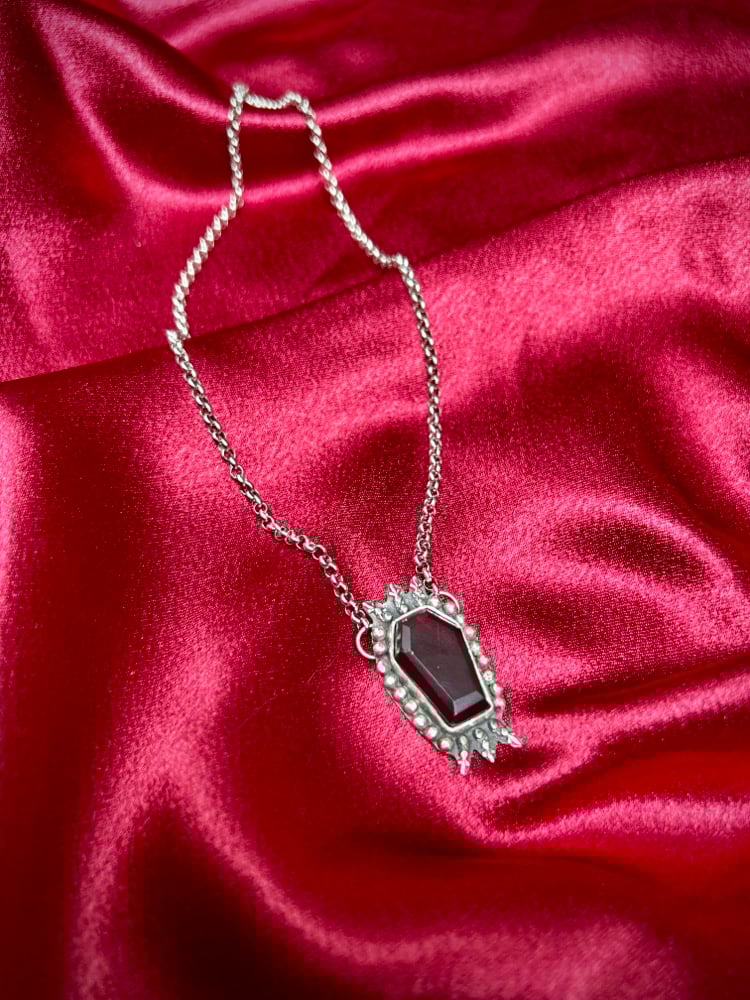 MADE TO ORDER Pendant handmade from sterling silver with a dark red coffin shaped, glass cabochon on a 18 inch stainless steel chain